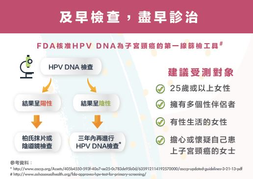 由於子宮頸癌形成前數年,子宮頸細胞已出現變異。醫生可從檢查中發現病變並及早作出治療,制止子宮頸癌的形成。表面上健康的婦女,在沒有任何病徵前進行檢查,就是子宮頸癌普查。HPV DNA檢查在感染初期便可檢測出已感染之病毒,在細胞病變前及早檢測出是否受到感染,對預防子宮頸癌極有幫助。
