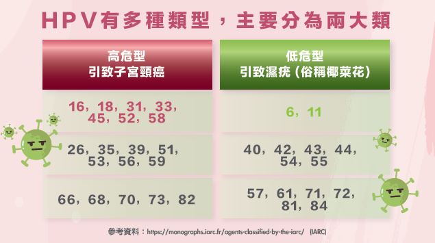 跟據世界衛生組織的分類,HPV病毒可分為高危致癌型及低危致癌型。高危型病毒是導致子宮頸癌的主要成因; 而低危型病毒則會引起濕疣 (俗稱椰菜花) 。