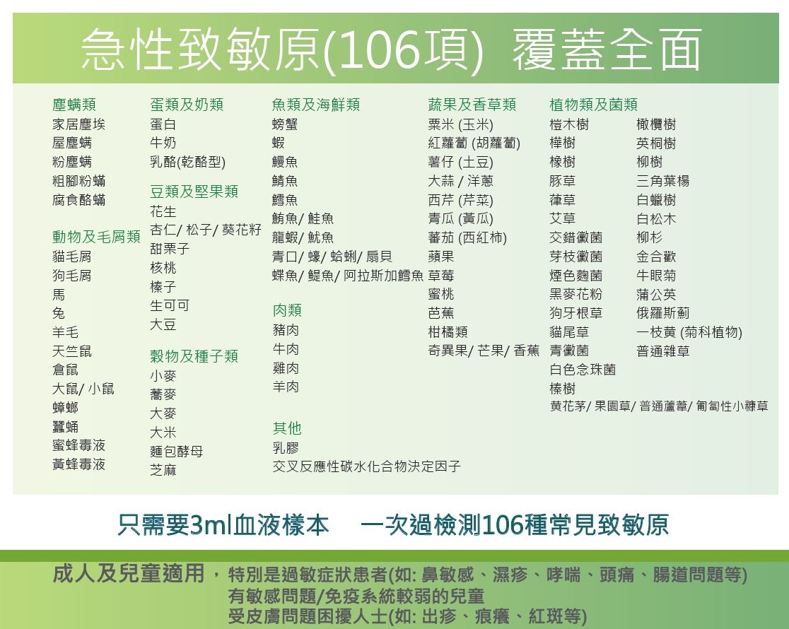 此技術量度在血液中流動的IgE抗體數量,可以檢驗出106種各類致敏原的致敏程度 :