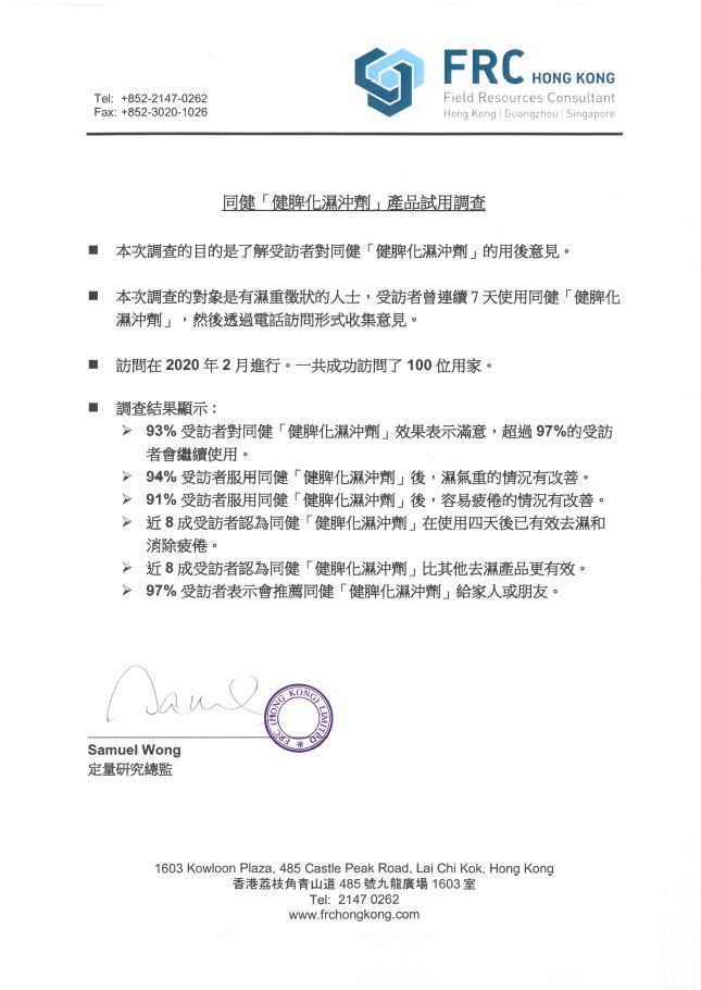 FRC調查報告證實93%用家認同「同健健脾化濕沖劑」有效袪濕及改善疲倦 (10-3-2020)